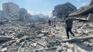 Palestinians inspect the damage following an Israeli airstrike on the El-Remal area in Gaza City