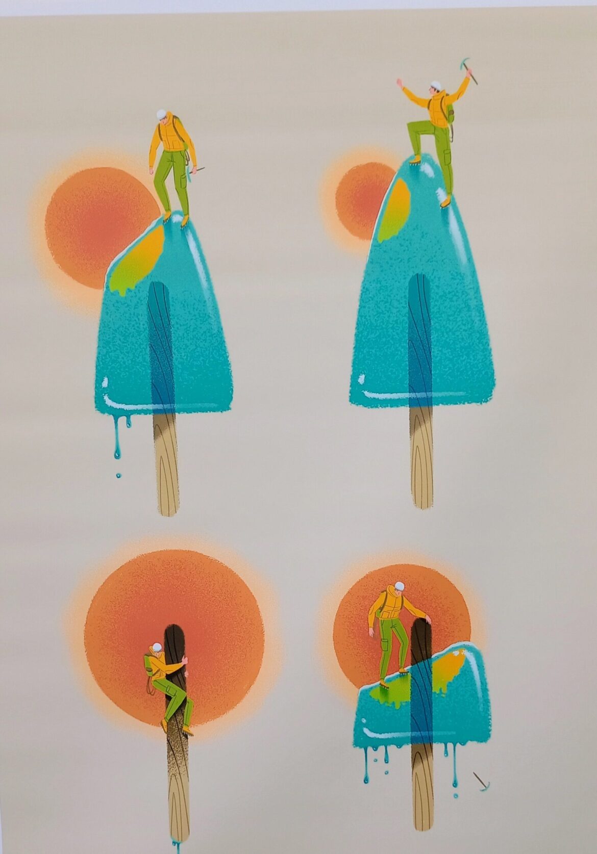 Le opere degli artisti invitati hanno messo in luce gli effetti del riscaldamento globale sulle nostre montagne attraverso l’uso di simboli, metafore visive, paradossi. Tra i temi principali affrontati c’è lo scioglimento dei ghiacciai, probabilmente il problema più impattante e visibile in alta quota. La montagna si squaglia come un ghiacciolo che mette a nudo la cieca ostinazione dell’uomo, nell’opera di Andrea de Santis illustrata nell’immagine.