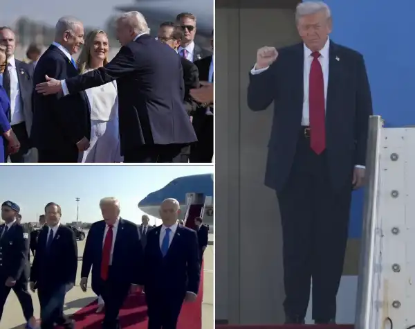 Con il tappeto rosso steso e una banda militare che suonava, il primo ministro israeliano Benjamin Netanyahu, il presidente Isaac Herzog e le rispettive consorti hanno dato il benvenuto in Israele al presidente degli Stati Uniti, Donald Trump. Trump è uscito dall’Air Force One da solo, pugno alzato e un grande sorriso, per poi scendere le scale d’imbarco.