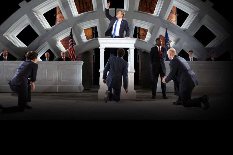 Anche il pubblico che dal 23 maggio di quest’anno ha affollato il teatro all’aperto a Central park per il primo dei due spettacoli della storica rassegna Free Shakespeare in the park sapeva benissimo cosa sarebbe successo: che Cesare sarebbe stato ucciso, che Antonio – qui Elizabeth Marvel, Heather Dunbar di House of cards – avrebbe pronunciato il suo elogio funebre, riuscendo a sobillare la folla di Roma contro i congiurati, e che alla fine anche Bruto – qui Corey Stoll, un altro interprete di House of cards, lo sfortunato Peter Russo – sarebbe stato ucciso. Quello che il pubblico non sapeva è come il regista Oskar Eustis avrebbe raccontato ancora una volta quella stessa storia, così universalmente nota, tante volte messa in scena. E chiaramente Eustis ha scelto di ambientare il dramma ai giorni nostri, rappresentando Cesare come Donald Trump. Nelle note di regia ha scritto: