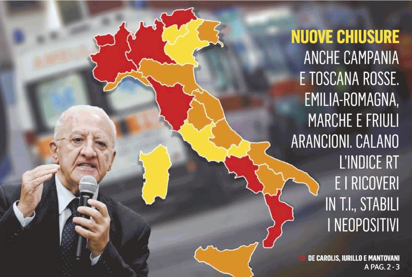 Chi ha paura del rosso? diceva uno slogan del Maggio francese. Oggi risponderei: Vincenzo De Luca, rieletto presidente in Campania con 7 voti su 10. Aveva minacciato di chiudere tutto: non lo ha fatto. Voleva usare il lanciafiamme: l’ha usato contro una bambina di 5 anni, “geneticamente modificata, nutrita col plutonio”, che chiedeva di andare a scuola come oggi fanno tanti studenti da Torino a Napoli. Definiva il Carderelli “eccellenza europea”, ma non gli forniva medici e mezzi. Ora che, alla fine, Speranza ha trasformato la Campania in zona rossa, De Luca chiama Di Maio sciacallo, castiga l’intesa tra il suo partito, il Pd, e gli “incompetenti” 5stelle, chiede una “solidarietà nazionale”.