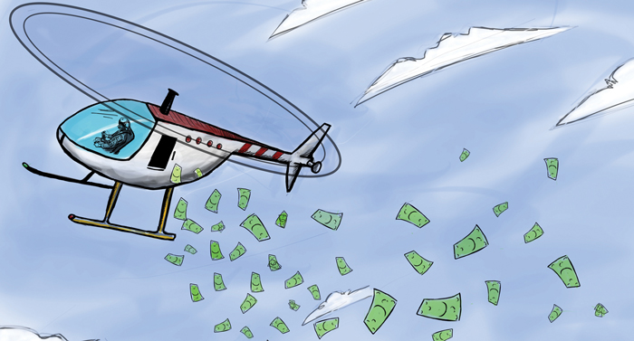 Gli economisti più attenti e competenti convengono che è necessaria un altro programma per finanziare l’economia reale, più radicale e diretto. Occorre che le banche centrali e gli stati immettano direttamente moneta e liquidità nell’economia reale per farla ripartire, anche saltando l’intermediazione bancaria. Si tratta del cosiddetto “denaro gettato dall’elicottero”: ovvero di idee elaborate da economisti del calibro di Milton Friedman, e, prima di lui, da J. M. Keynes (con la metafora del denaro da estrarre liberamente da una buca) –. Ben Bernanke, l’ex presidente della Banca Centrale americana, la Federal Reserve, è stato ed è tuttora uno dei fautori dell’HM.