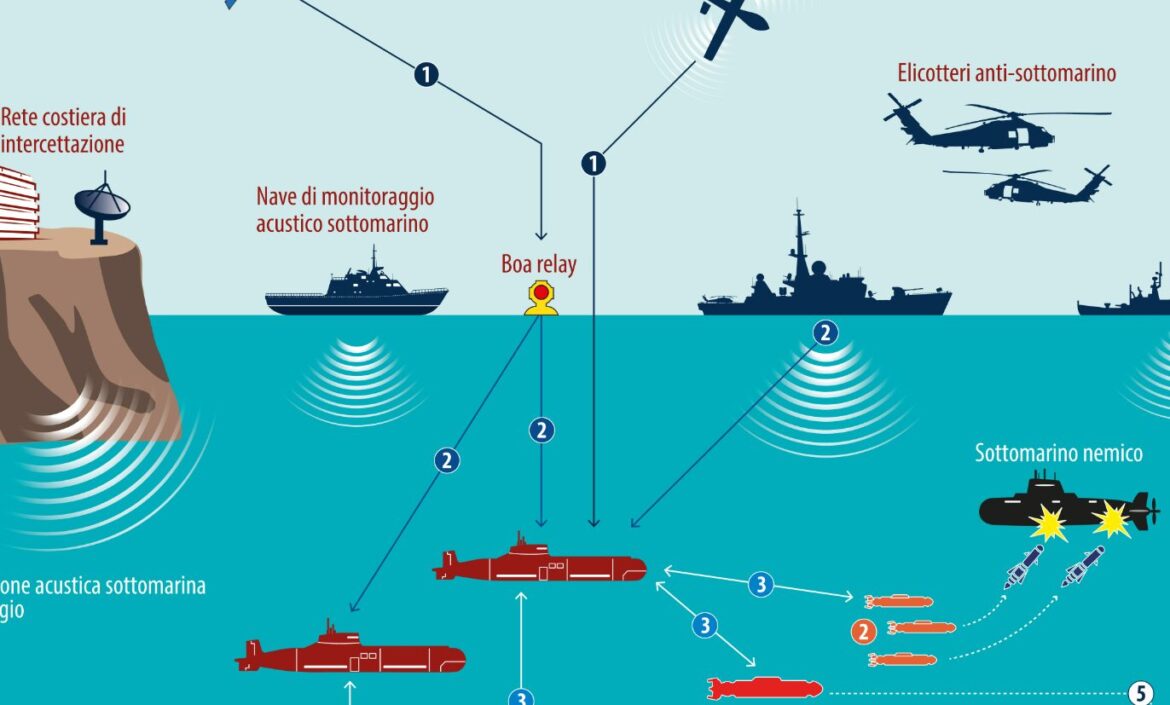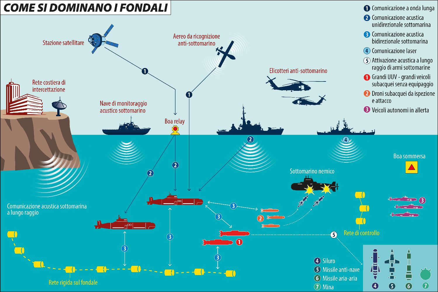 L’infografica illustra l’articolato dispositivo militare indispensabile a ottenere la supremazia negli abissi e di conseguenza la protezione delle reti strategiche, dai gasdotti ai cavi Internet. Il know-how necessario è ragguardevole e spazia dalle ricognizioni aeree al monitoraggio satellitare, dalle comunicazioni acustiche a quelle laser, dall’attivazione a lungo raggio di armi sottomarine ai grandi veicoli subacquei senza equipaggio, dalle mine alle boe, dai siluri ai missili anti-nave…
