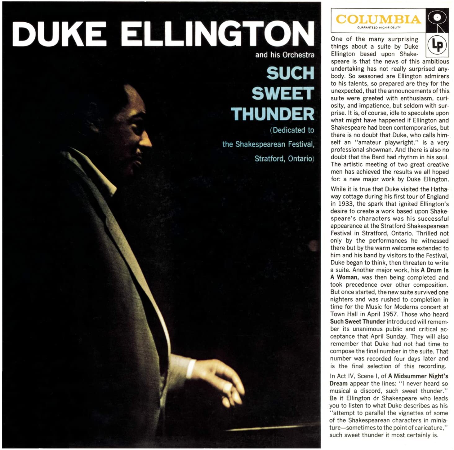 L’occasione per scrivere questa suite così originale è loro offerta da uno spettacolo che l’orchestra di Duke Ellington fa nel ’56 allo Shakespeare Festival della cittadina di Statford nell’Ontario, dove da soli tre anni alcuni appassionati hanno cominciato ad allestire questa rassegna, grazie anche alla disponibilità di alcuni grandi attori, come Alec Guiness che nella prima edizione del ’53 mette in scena Riccardo III e Tutto è bene quello che finisce bene senza richiedere alcun cachet. Ellington e Strayhorn decidono di rimanere al festival per un’intera settimana, dopo il concerto, incontrano studiosi del Bardo, parlano e si confrontano con loro. Billy ama moltissimo le sue opere teatrali, le cita di continuo, qualcuno nell’orchestra lo chiama Shakespeare, e anche nella biblioteca di Duke c’è un’edizione consumata e molto sottolineata. Ormai la decisione è presa: l’anno successivo torneranno al Festival con una loro suite dedicata a Shakespeare.