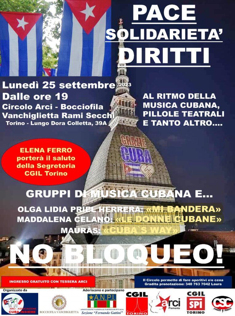 Questo  25 settembre 2023, dalle ore 18 in poi,  nella città di Torino, varie organizzazioni sociali, politiche e sindacali della città piemontese, hanno organizzato un evento di solidarietà con Cuba, contro il bloqueo e per la solidarietà internazionale. L’ iniziativa, ideata e promossa dall’ Ass. Arci CubaInsieme in collaborazione con la Bocciofila Vanchiglietta, ha ottenuto il patrocinio e la con-partecipazione dell’ ARCI Piemonte, dell’ ANPI, della CGIL di Torino,  della CGIL SPI di Torino e il Coordinamento della Solidarietà con Cuba (CSC). L’ evento è stato presentato e introdotto dal compagno Moreno Bacchieri e, la cubana residente in Italia, Olga Lidia Priel Herrera, attivista della comunità dei cittadini del suo paese, ha realizzato una performance artistica (un reading poetico) e, messo in risalto, il saluto inviato dal console cubano di Milano, Marcos Hernández Sosa, per l’ evento. Il console ha ringraziato coloro che “sono sempre rimasti con Cuba” e che il loro appoggio “da forza”. Il Console cubano, rivolgendosi ai presenti con il suo messaggio di saluto, ha evidenziato che il suo paese, dopo il trionfo della Rivoluzione del 1959, soffre l’attacco del governo degli Stati Uniti, che intende soffocarlo economicamente, cercando di provocare un bagno di sangue per rovesciare il governo, ma “non è mai stato in grado di raggiungere questo obiettivo e non sarà in grado di raggiungerlo”. Sono arrivati anche messaggi audio da parte dell’ Icap (Istituto Cubano per la Solidarietà tra i popoli) di Pinar del Rio, in particolare da Otto L. Medero Ungo e da Yana Rosa Figueroa Castillo. Il messaggio dell’ Icap Pinar del Rio dichiara quanto segue: