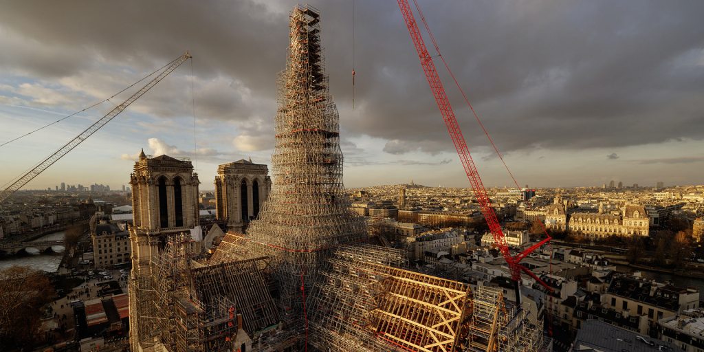 Dopo l’infausto 15 aprile 2019 ci si mise febbrilmente all’opera. Il restauro, condotto in tempi a lungo giudicati impossibili, ha impegnato le sostanze finanziarie messe a disposizione da 340.000 donatori e ha impegnato un immenso cantiere nel quale hanno lavorato, oltre a migliaia di maestranze, 2000 artigiani provenienti da ogni parte della Francia insieme con alcuni specialisti, carpentieri-restauratori, provenienti dagli Stati Uniti d’America.