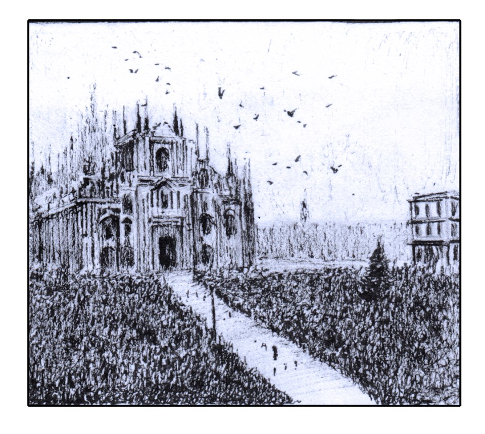 Sullo sfondo la Banca Nazionale Dell’agricoltura, da vent’anni non più in attività, ma la cui scritta è stata volutamente mantenuta in ricordo della strage del 1969 [foto dell’autrice]