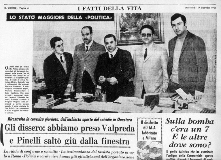 Dall’edizione de “Il Giorno” del 17 dicembre: i primi da destra sono Calabresi e Allegra. Sotto la ricostruzione ufficiale della nottata in Questura