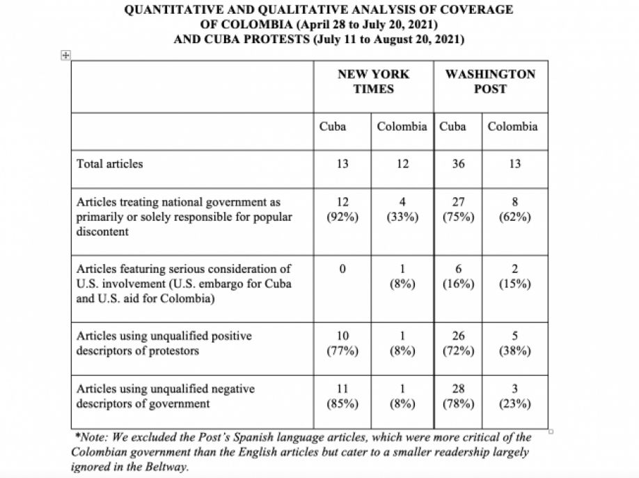 Sebbene le proteste in Colombia persistessero da almeno cinque giorni prima che un qualsiasi giornale ne parlasse, la copertura su Cuba è iniziata dopo poche ore che le proteste fossero iniziate attirando “un’attenzione sproporzionata”: 13 articoli per Cuba contro 12 per la Colombia sul New York Times e 36 articoli per Cuba contro i soli 13 della Colombia sul Washington Post”.