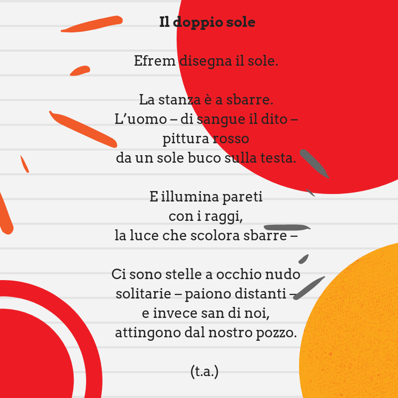 *Nel bel racconto che ha ispirato questi versi, c’è un uomo chiuso in manicomio. Ama dipingere ma non ha pennelli. Usa un dito e il suo sangue, usa se stesso fino all’ultimo per illuminare il sole.