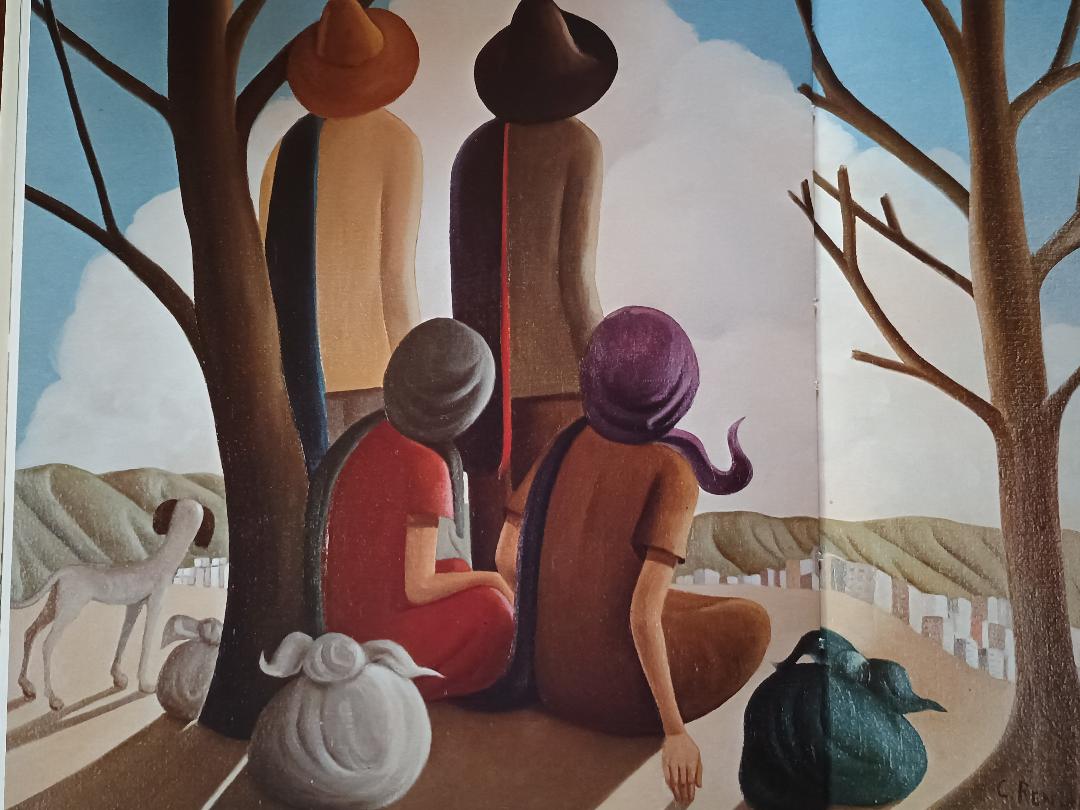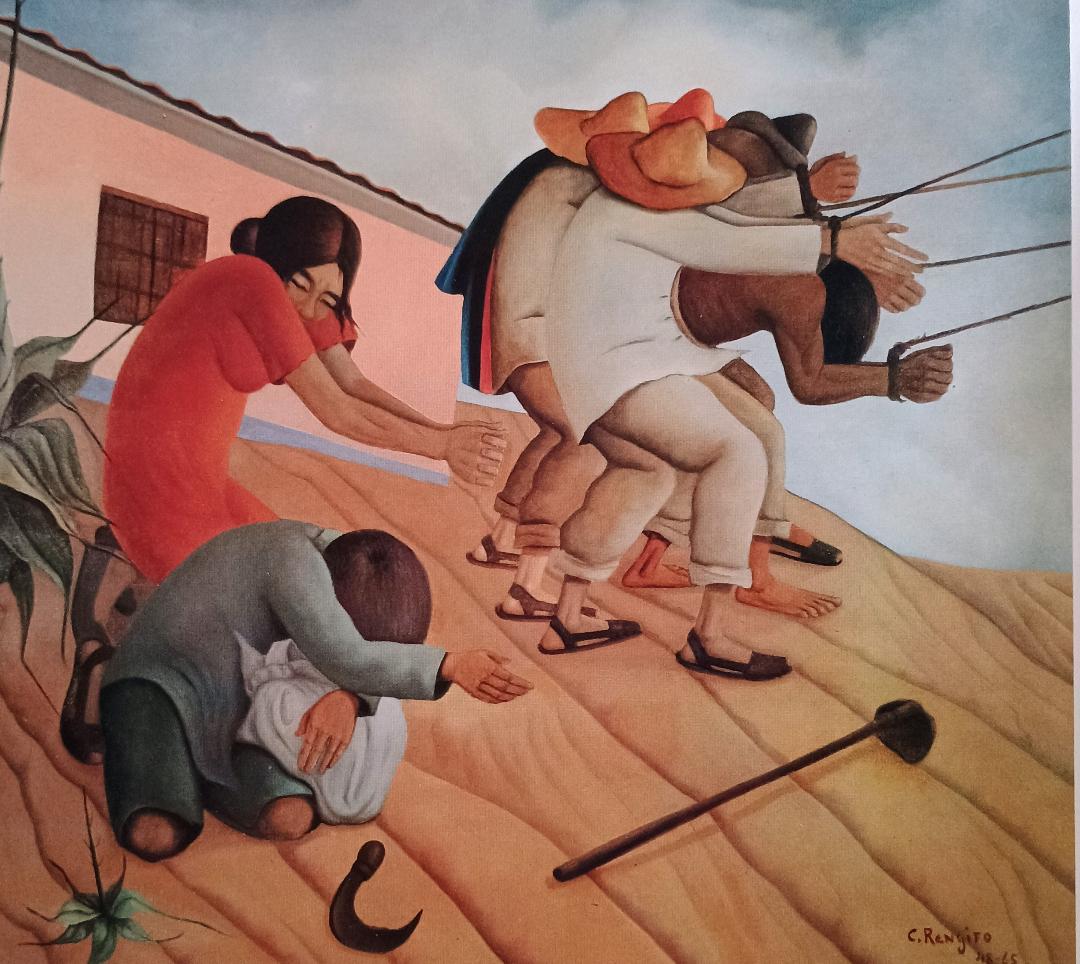 Sento a volte l’impulso a rituffarmi nei ricordi. Nello scrivere queste idee, mi muove capire la natura e l’essere del ricordo, perché la vita già passata abbia un senso, e quindi scoprirne la valenza. Nell’opera pittorica dell’artista venezuelano Cèsar Rengifo (1915-1980) ritrovo il mutamento che è avvenuto in me attraverso il ricordo custodito, che affiora quando ora sfoglio dopo anni il libro della sua opera. E vi vedo transitare figure alle quali la storia e il destino sembrano aver loro riservato la sorte peggiore. Addolorati, ma non sconfitti, questi abitanti delle disgrazie sono raffigurati spesso a piedi scalzi, sulla terra aspra o di fronte ai campi devastati dallo sfruttamento del petrolio, o quali rifugiati sulle colline di Caracas dove, esodati dalle campagne, hanno costruito le loro casupole alla men peggio. La prima immagine è il reclutamento forzato dei giovani, dove è palpabile la sofferenza e il dramma che l’artista fa suoi e porge allo sguardo. E allora mi pare di rivedere la gente del popolo e i campesinos che incontravo nei miei primi tempi appena arrivato in Venezuela, vestiti con semplicità e calzati eventualmente con ciabatte. Quelle casupole chiamate ranchos abbondavano sulle alture di Caracas, a contatto l’una con l’altra forse per approfittare la parete in comune. La promiscuità era diffusa, i servizi igienici deficienti, l’acqua potabile trasportata in alto a mano con recipienti. Nella valle, c’era la Capitale con i suoi edifici, centri commerciali, ville e residenze borghesi, strade asfaltate, avenidas e parchi pubblici; nei quadri di Rengifo si percepiscono sullo sfondo, irraggiungibili e fuori portata, come nell’immagine finale Ellos y la Ciudad.
