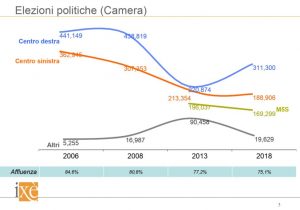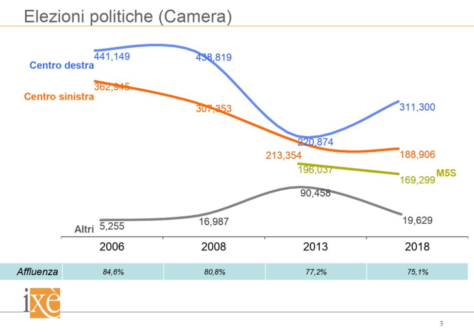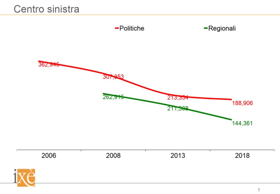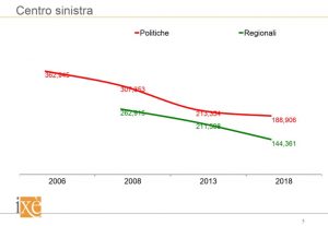 Dunque in termini di voti effettivi il bacino di centro-sinistra, mostra segni di progressivo rimpicciolimento. Oggi, rispetto al 2006, gli elettori rimasti sono pari a 144.361. Guardando alle sole elezioni politiche, rispetto al lontano 2006 osserviamo un andamento di questa natura: 55.592 (il 15,3%) voti si perdono nel 2008 quando alla guida del Pd c’è Veltroni; del patrimonio rimasto ulteriori 94.000 voti (il 30,6%) se ne vanno durante la gestione Bersani; 24.448 voti infine (pari all’11,4%) spariscono con il PD a guida Renzi. Un bilancio che si fa assai più pesante per il partito concepito in chiave di auto-sufficienza, se guardiamo alle ultime due elezioni regionali. Si parte da un raccolto di 211.508 voti e si atterra con 144.361 voti (meno 31,7%).