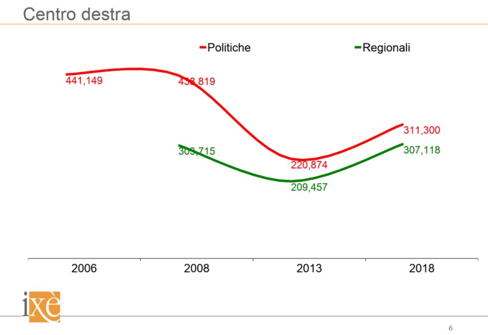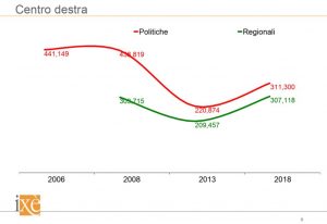 Ben diversa la tendenza della “famiglia” legata al centro-destra. Subisce il colpo delle politiche 2013 sostanzialmente dimezzando i consensi effettivi, mostra segni di netta ripresa alle regionali di qualche mese dopo perdendo di misura le elezioni vinte da Deborah Serracchiani, ma avvicinandosi ai volumi delle nazionali, risale di oltre 100.000 voti alle elezioni nazionali di quest’anno, per raggiungere infine il voto più alto mai registrato alle elezioni Regionali con Fedriga.