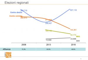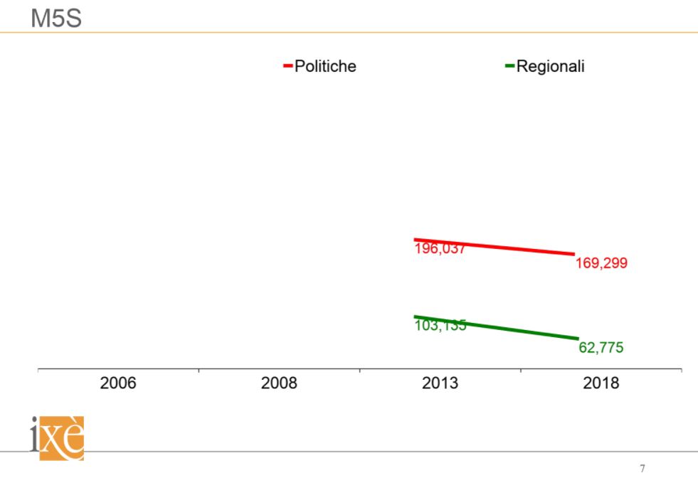 La famiglia mononucleare del M5S mette invece in evidenza un andamento in cui le fiammate sono pari alla friabilità; nel voto a carattere regionale testimonia un netto deficit di credibilità, a soli pochi mesi di distanza dal voto politico infatti il bacino di consensi si riduce brutalmente passando nel 2013 a circa la metà (da 196.000 a 103.000) e nel 2018 a poco più di un terzo (da 169.000 a 62.000). In entrambi i casi la caduta è verticale e mette in luce una debolezza di radicamento, di proposta e di personale politico che a cinque anni dalla nascita e dall’affermazione del M5S, mostra tratti cronici in particolare nel nord. Nella dimensione squisitamente territoriale, la radicalità di offerta sembra evaporare, fino ad apparire clandestina testimonianza.