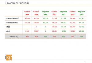 L’inizio a nostro insindacabile giudizio sono le elezioni politiche del 2006, quelle della vittoria dimezzata per così dire, ma anche quelle in cui la ‘famiglia’ del centro-sinistra (a metterci dentro tutti, moderati, centro-sinistri e sinistrissimi) raggiunge in una regione tradizionalmente ‘moderata’ il più alto numero di consensi di sempre: 362.945 voti. Da allora si susseguono altre 3 tornate elettorali nazionali e ben 3 elezioni per il rinnovo della Presidenza della regione.