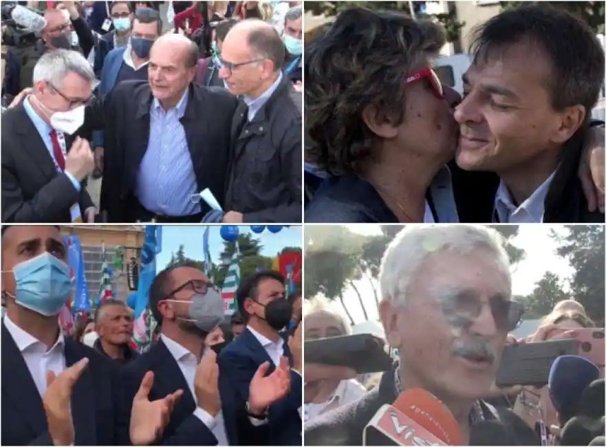 Capire chi c’è. Ecco Enrico Letta. Il segretario del Pd arriva a piedi e cerca subito Maurizio Landini. Fotografi e cameraman, eccitati, in semicerchio: tra i due un abbraccio lungo, sinceramente affettuoso; poi si aggiunge Pier Luigi Bersani, dicendo una cosa nell’orecchio di Landini. («Anche negli anni Settanta, in una stagione ben più dura di questa, era il sindacato che toglieva tutti dall’imbarazzo delle bandiere. E infatti, in alcune manifestazioni, c’era sempre una certa destra liberale, costituzionale – riflette Bersani – Mi chiedo allora dove sia quella attuale. Lo sanno o no che questa è una Repubblica fondata sull’antifascismo?»).