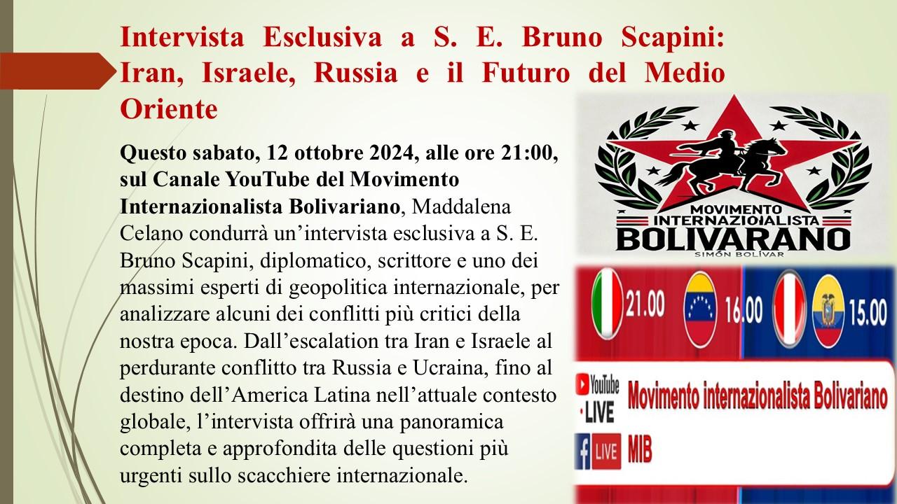 Questo sabato, 12 ottobre 2024, alle ore 21:00, sul Canale YouTube del Movimento Internazionalista Bolivariano, Maddalena Celano condurrà un’intervista esclusiva a S. E. Bruno Scapini, diplomatico, scrittore e uno dei massimi esperti di geopolitica internazionale, per analizzare alcuni dei conflitti più critici della nostra epoca. Dall’escalation tra Iran e Israele al perdurante conflitto tra Russia e Ucraina, fino al destino dell’America Latina nell’attuale contesto globale, l’intervista offrirà una panoramica completa e approfondita delle questioni più urgenti sullo scacchiere internazionale. Negli ultimi giorni, il Medio Oriente è stato scosso dal più massiccio attacco missilistico iraniano contro Israele dal 1979, una rappresaglia per l’uccisione di Ismail Haniyeh, leader di Hamas, e Hassan Nasrallah, Segretario Generale di Hezbollah. Con oltre 180 missili balistici, compresi i nuovi ipersonici Fattah-1, l’Iran ha dimostrato una potenza militare senza precedenti. Tuttavia, la vera incognita risiede nella risposta israeliana, che si preannuncia decisiva per i futuri equilibri della regione. S. E. Scapini approfondirà le implicazioni di questo attacco e analizzerà le possibili reazioni di Israele e dei suoi alleati occidentali, in particolare gli Stati Uniti, già coinvolti nell’assistenza militare a Tel Aviv attraverso i sistemi di difesa Arrow 2 e 3. Non meno rilevante sarà la discussione sulla guerra tra Russia e Ucraina, un conflitto che ha ormai superato i due anni, segnando una delle più grandi crisi europee dalla Seconda Guerra Mondiale. S. E. Scapini offrirà una riflessione sulle dinamiche politiche ed economiche che stanno ridefinendo l’Europa dell’Est e l’influenza geopolitica globale di Russia e NATO. Inoltre, verranno affrontate le ripercussioni di questa guerra sul Medio Oriente e sui nuovi equilibri tra Russia, Cina e Iran, potenze emergenti che stanno sfidando l’egemonia occidentale. Infine, lo sguardo si sposterà sul futuro dell’America Latina. In un contesto globale sempre più frammentato, il continente latinoamericano si trova a un bivio: da una parte, una crescente resistenza contro l’ingerenza straniera, dall’altra, la lotta per affermare un nuovo ordine multipolare. S. E. Scapini rifletterà su come i governi progressisti del Sud America stiano navigando in questo complesso scenario geopolitico, con particolare attenzione alle alleanze con potenze emergenti come la Cina e l’influenza politica di movimenti come il bolivarianismo, che cerca di rafforzare l’autonomia della regione.