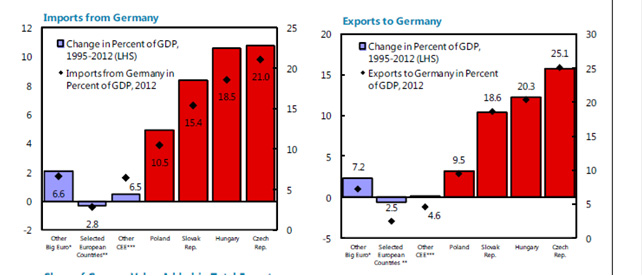 Dall’inizio degli anni Novanta l’industria manifatturiera tedesca ha cominciato a decentrare fasi della propria produzione nei vicini paesi dell’Europa centro orientale, soprattutto Polonia, Repubblica Ceca, Slovacchia, Ungheria. Questo fenomeno ha riguardato soprattutto l’industria automobilistica (WiiW 2018 CI VUOLE UN TITOLO), ma si è anche estesa ad altre parti più sofisticate dell’industria automobilistica. Il basso costo del lavoro, la vicinanza e la manodopera qualificata. Il rafforzamento dei legami produttivi fra l’economia tedesca e i vicini paesi ex-Comecon è visibile dalla crescita bilaterale del commercio internazionale fra questi paesi, crescita mostrata dai grafici seguenti.