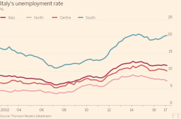 Conseguenza di un tasso di crescita basso e della ristrutturazione industriale causata dalla seconda globalizzazione è che il tasso di disoccupazione è aumentato dal 2002 al 2017 in modo considerevole, ma distribuito in modo diverso su tutto il territorio nazionale con tassi di disoccupazione molto diversi fra Nord, Centro e Sud. Mentre il Nord ed il Centro hanno un tasso di disoccupazione tende attualmente verso il 10 %, il sud ha un tasso di disoccupazione del 20 %. I dati della disoccupazione giovanile sono peggiori e ovviamente spaventosi per il Sud. Ma forse la cosa più interessante del grafico è che il colpo finale che mette in ginocchio il paese è la seconda recessione post-crisi (quella dovuta al governo Monti). Come vediamo infatti, la crisi globale 2008-09, ben grave, aveva fatto accelerare la crescita della disoccupazione meno della successiva recessione montiana. Cioè il paese non cede e non reagisce.