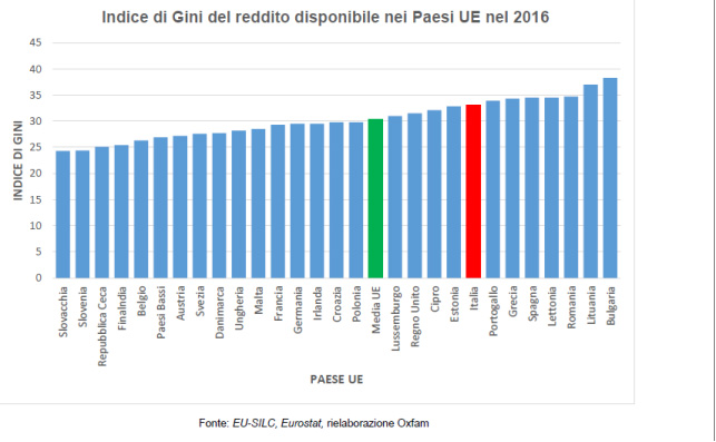 Il peggioramento della distribuzione del reddito e della ricchezza è un fenomeno mondiale ben descritto dai lavori di Piketty e Milanovic; anche l’Italia ha partecipato a questo generale peggioramento che è proprio di tutti le fasi di globalizzazione (Milanovic). Il coefficiente di Gini che misura la diseguaglianza del reddito all’interno di un paese il cui valore va da 0 a 1, più è alto più la distribuzione del reddito è diseguale. Nel 2016 il coefficiente di Gini per l’Italia era 33,1 risultando il ventiduesimo paese per diseguaglianza fra i 28 paesi UE, maggiore di circa due punti sulla media Ue.