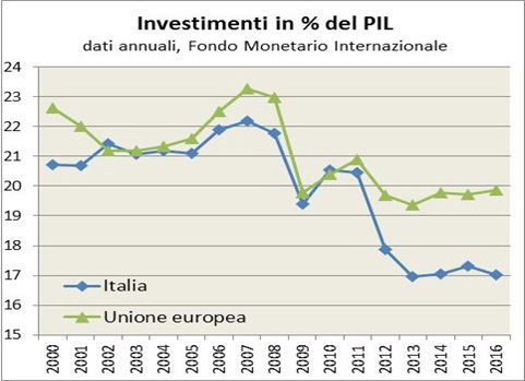 La lunga crisi italiana non si è manifestata con la crisi mondiale che parte dagli Stati Uniti nel settembre 2008 con il fallimento della banca d’affari Lehman Brothers, ma comincia a manifestarsi molto prima. Possiamo datarne l’inizio con la svalutazione della lira del settembre 1992 e il crollo del prezzo delle obbligazioni italiane sui mercati internazionali, per proseguire poi con il continuo aumento del debito pubblico e la difficoltà nel ridurlo, problemi seguiti poi dallo stentato tasso di crescita dei primi anni Duemila, e congiunto calo continuo della produttività del sistema economico, crollo degli investimenti pubblici e privati, non ché un continuo aumento del divario Nord e Sud, tale da mettere in discussione l’unità del paese. Tutti questi fattori si riflettono nell’andamento del PIL italiano, come vediamo dal grafico seguente.