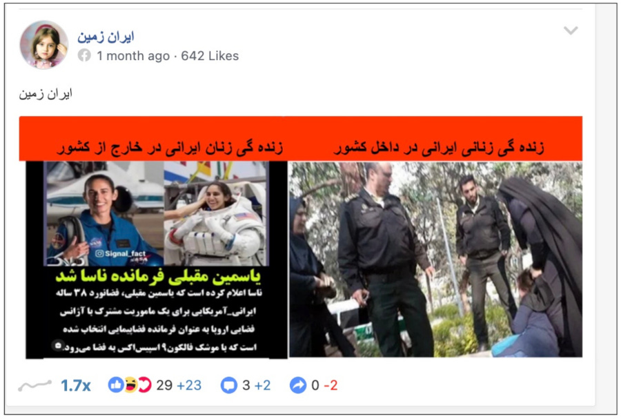 Ad esempio, alcuni bot e troll “iraniani” del Pentagono promuovevano opinioni “integraliste”, criticando la Repubblica Islamica per essere troppo liberale a livello interno e non sufficientemente aggressiva nell’affermare i propri interessi a livello regionale. Altri si presentavano come esponenti della sinistra, laici e come elementi dell’opposizione. Era un attacco digitale a tutto campo. In modo inquietante, molti di questi account promuovevano i diritti delle donne e le proteste contro lo hijab. Un meme diffuso dal Pentagono aveva paragonato il trattamento delle donne all’estero con quello in Iran, contrapponendo le foto di astronaute occidentali e di una presunta iraniana vittima di abusi domestici.