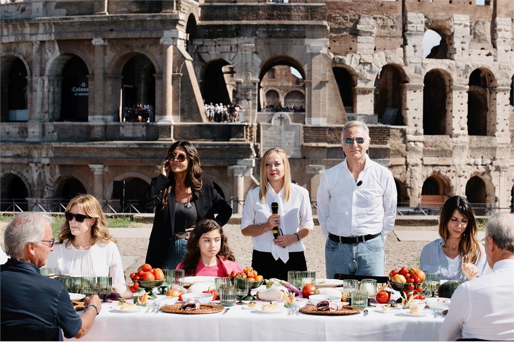 Sono passate da poco le 14.30 quando sugli schermi di mezza Italia, nei primi blocchi della puntata inaugurale della nuova stagione di Domenica In, lo storico contenitore di Rai Uno, condotto da Mara Venier, compare una tavola all’aperto, imbandita e festosa. Lo sfondo non è il balcone di zia, né una piazzetta da cartolina, ma il Colosseo. Ma è quando, uno dopo l’altro, compaiono i «commensali» che la scena si fa quantomeno curiosa. Sullo schermo c’è anche la premier Giorgia Meloni, infatti, con Sabrina Ferilli e Paolo Bonolis, oltre allo chef Heinz Beck che – dall’alto delle sue tre stelle Michelin attribuite al ristorante romano «La Pergola» – non si può certo dire che stoni. E poi c’è Gianmarco Mazzi, oggi sottosegretario alla Cultura, ma vero trait-d’union fra il governo Meloni e il mondo dello spettacolo che lo ha visto dirigente di primo piano, a partire dalla direzione artistica per vari Festival di Sanremo di successo) .
