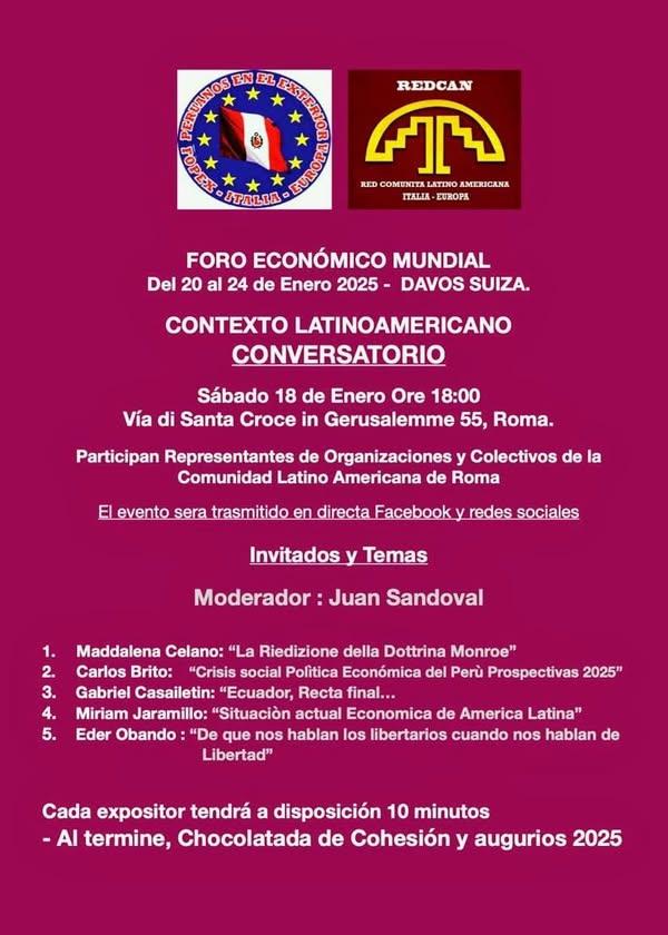 In preparazione al Foro Economico Mondiale, tenutosi dal 20 al 24 gennaio 2025 a Davos, Svizzera, la comunità latinoamericana romana ha avuto il piacere di organizzare il Conversatorio sul Contesto Latinoamericano, organizzato dalla Red de Comunidad Latinoamericana Italia-Europa (REDCAN) e dalla Federazione dei Peruviani all’Estero.
