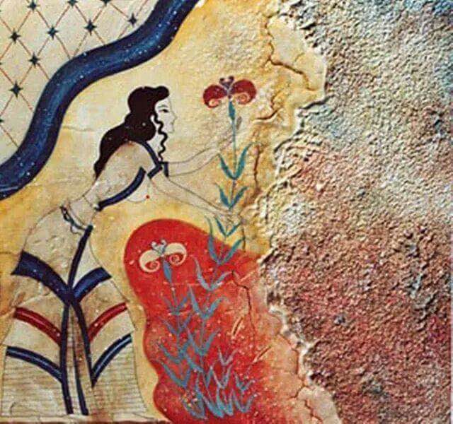 Se indaghiamo tra i reperti e gli affreschi della più avanzata (e purtroppo anche ultima) civiltà pre-indoeuropea, ovvero quella minoica di Creta (vedi nota), troviamo rappresentazioni di giovani donne con abiti, acconciamenti ed ornamenti, che potremmo definire ultramoderni, nonché con ben studiate e deliziose aperture sul petto, per mostrare il simbolo più evidente della venerata femminilità. In genere si tratta di giovani donne intente a stabilire idilliaci rapporti con le piante e gli animali, ritratte dall’artista in onore delle elargizioni della Dea. In tutti gli affreschi rinvenuti possiamo ammirare come l’artista stabilisce un rapporto con ciò che considera del tutto meravigliosamente naturale, spesso rappresentato da animali in coppia, come per voler evidenziare il più che magico agire della riproduzione, quale manifestazione più eclatante ed appariscente della Grande Dea.