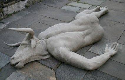 : La scultura di Emil Alzamora, a mio avviso, si colloca perfettamente nel nostro tempo dove il potere soverchia sempre di più i deboli, incapaci di far sentire la loro voce. A differenza del mito del Minotauro, mostro dal corpo di uomo e dalla testa di toro,generato dalla moglie di Minosse, re di Creta e dal bellissimo toro bianco e quindi di alta stirpe, pericoloso per la sua forza per il regno di Minosse e quindi del potere, l ‘artista vede un uomo con la testa di un toro abbattuto e morente, simbolo di una umanità divenuta facile preda del potere per la sua docilità e acquiescenza. (L.L.)