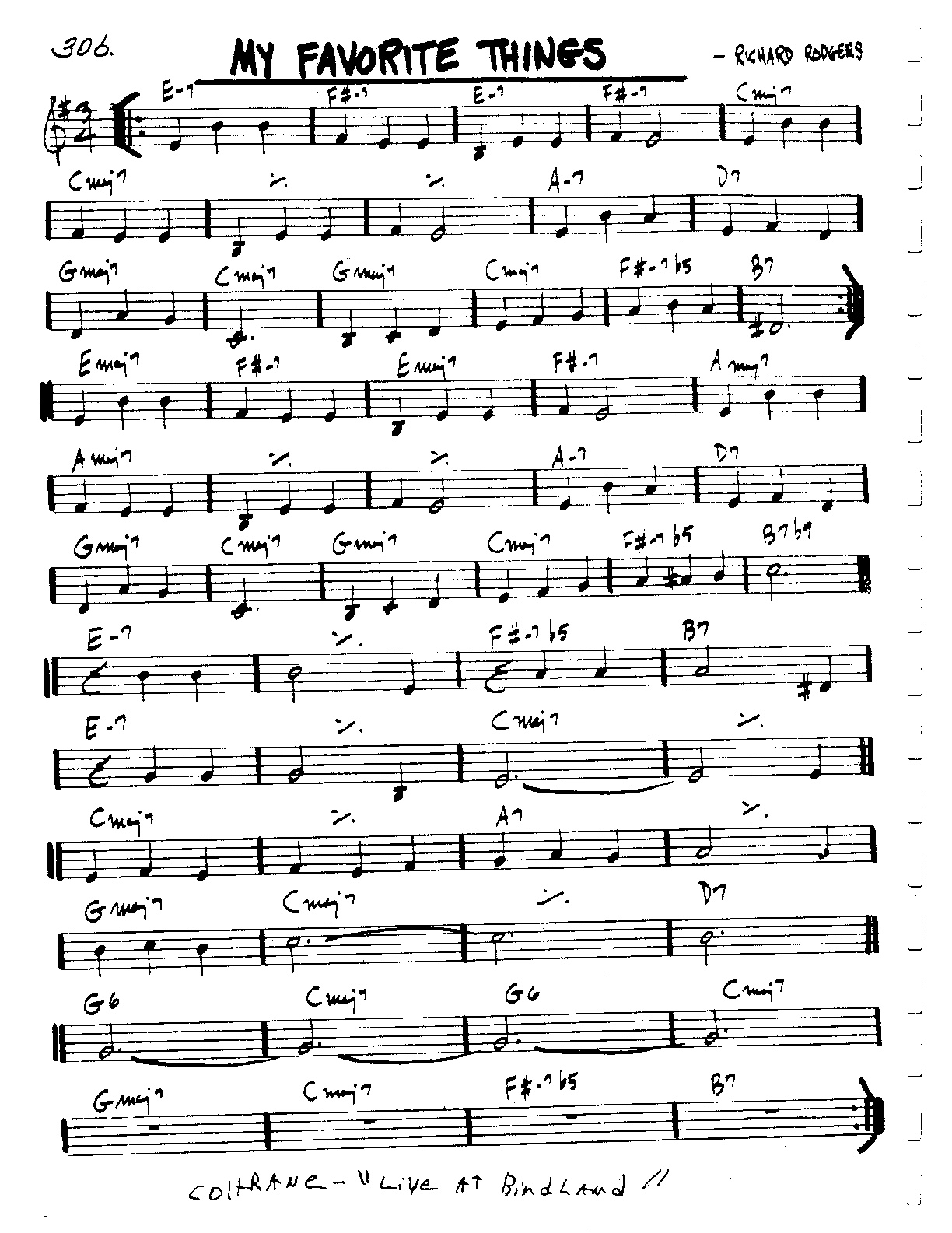 E’ il 1960: nonostante il successo di Kind of blue, John decide di lasciare il gruppo di Miles Davis e fonda il proprio quartetto con McCoy Tyner al pianoforte, Steve Davis al contrabbasso ed Elvin Jones alla batteria. Ha voglia di esplorare le possibilità espressive del sax soprano e di esercitare il suo stile musicale su alcuni brani “classici”, ormai diventati standard jazz. Ne sceglie due di Gershwin, But not for me e Summertime – su cui aveva già lavorato a lungo Davis con la sua tromba – uno di Cole Porter, Ev’ry time we say goodbye, e poi una canzone che l’anno precedente Rodgers e Hammerstein hanno scritto per il loro nuovo musical, The sound of music. Non è certo la canzone più famosa di quello spettacolo, ma a Coltrane piace molto ed è sicuro di riuscire a ricavarne quello che sta cercando. Ha ragione: My favorite things, quella traccia di quasi quattordici minuti in cui lui e Tyner intrecciano i loro assoli su una melodia apparentemente semplice, diventerà uno dei suoi brani più famosi. Lo interpreterà molte altre volte e ogni volta sarà sempre differente da quella prima storica registrazione. In un concerto a Tokyo del 1966 quel brano dura quasi un’ora.