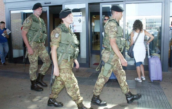 Si sa l’arrivo dell’esercito, l’ho letto sul giornale, proprio come una volta,  e ce lo dice la tv, avrebbe un effetto rassicurante per i cittadini e scoraggiante per chi trasgredisce. Pare che vedere giovanotti svogliati che fischiano al passaggio delle ragazze, fumandosi una sigaretta sulla porta dei palazzi del potere proprio come i commessi di Prada o di Gucci davanti alle fastose boutique, indifferenti alla ostensione da parte di cronisti di scoop di zainetti abbandonati e viaggi di babbi affettuosi che recano fucili giocattolo accuratamente scartati, rechi sollievo e mitighi l’allarme per i pericoli dei quali nutrono il nostro immaginario.  Abituati a pensare che ci beviamo qualsiasi ciancia, menzogna, illusione erogati generosamente dalla loro narrazione, sembrano persuasi che manifestazioni di muscolarità, rinuncia a libertà e privacy, conferimento coatto di disperati in lager, in accampamenti o sulle panchine di giardinetti, come spot viventi dei rischi che corriamo, costituiscano un efficace deterrente per clan, che sappiamo essere intenti alla scalata a società e  banche, alla partecipazione a appalti opachi ben poco contrattati da autorità sempre più depauperate di poteri e quattrini, o per terroristi e foreign fighters, ben poco “foresti” , solitamente ben radicati nel pingue Belgio o i Franca e che non sono soliti procurarsi “vacanze-avventura” su precari barconi.