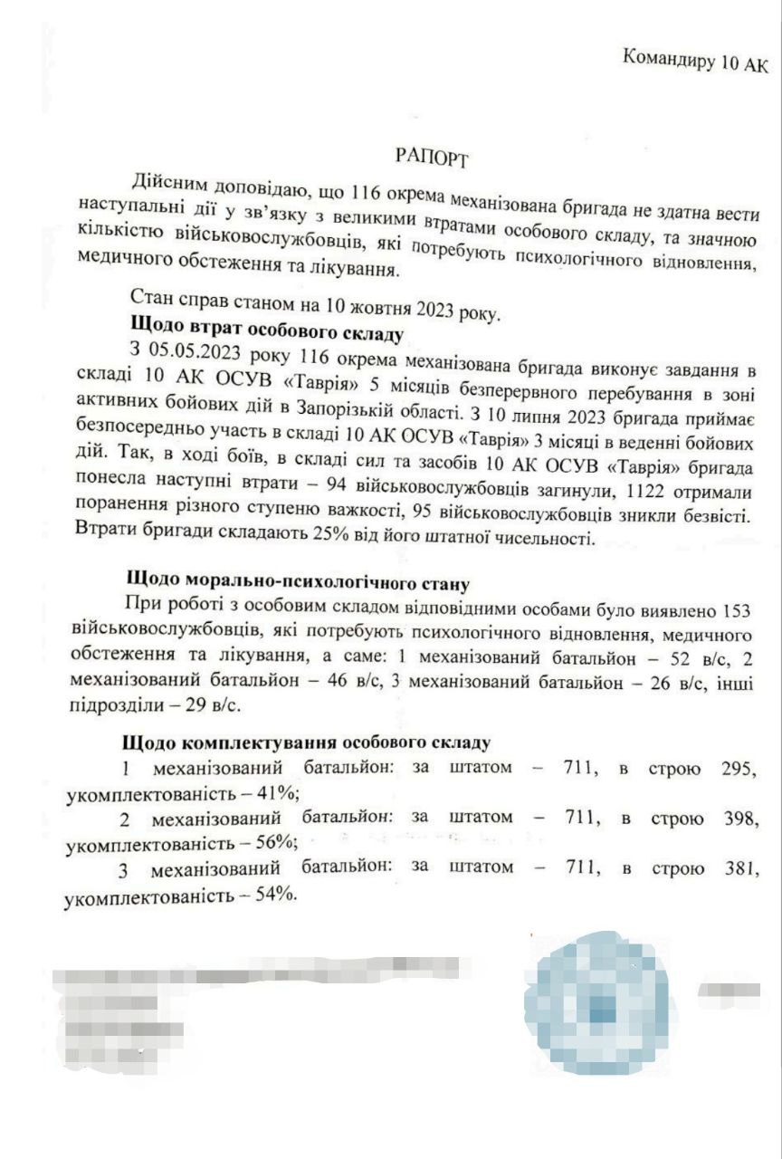 Il documento allegato, di cui è stata verificata l’autenticità, è un rapporto di metà ottobre inviato al comandante del 10° Corpo d’Armata dell’AFU.