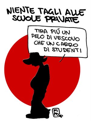 Ma non certo grazie al mercato: le scuole private, per due terzi cattoliche, sono in crisi da lustri. Sono scuole di qualità inferiore, buone solo per gli amanti dei ghetti. Per superare la scuola di tutti occorrono invece ministri della (ex) pubblica istruzione che si impegnino a demolirla, e governi-regioni-province-comuni che facciano a gara a svuotare le casse pubbliche per finanziare il diplomificio cattolico.