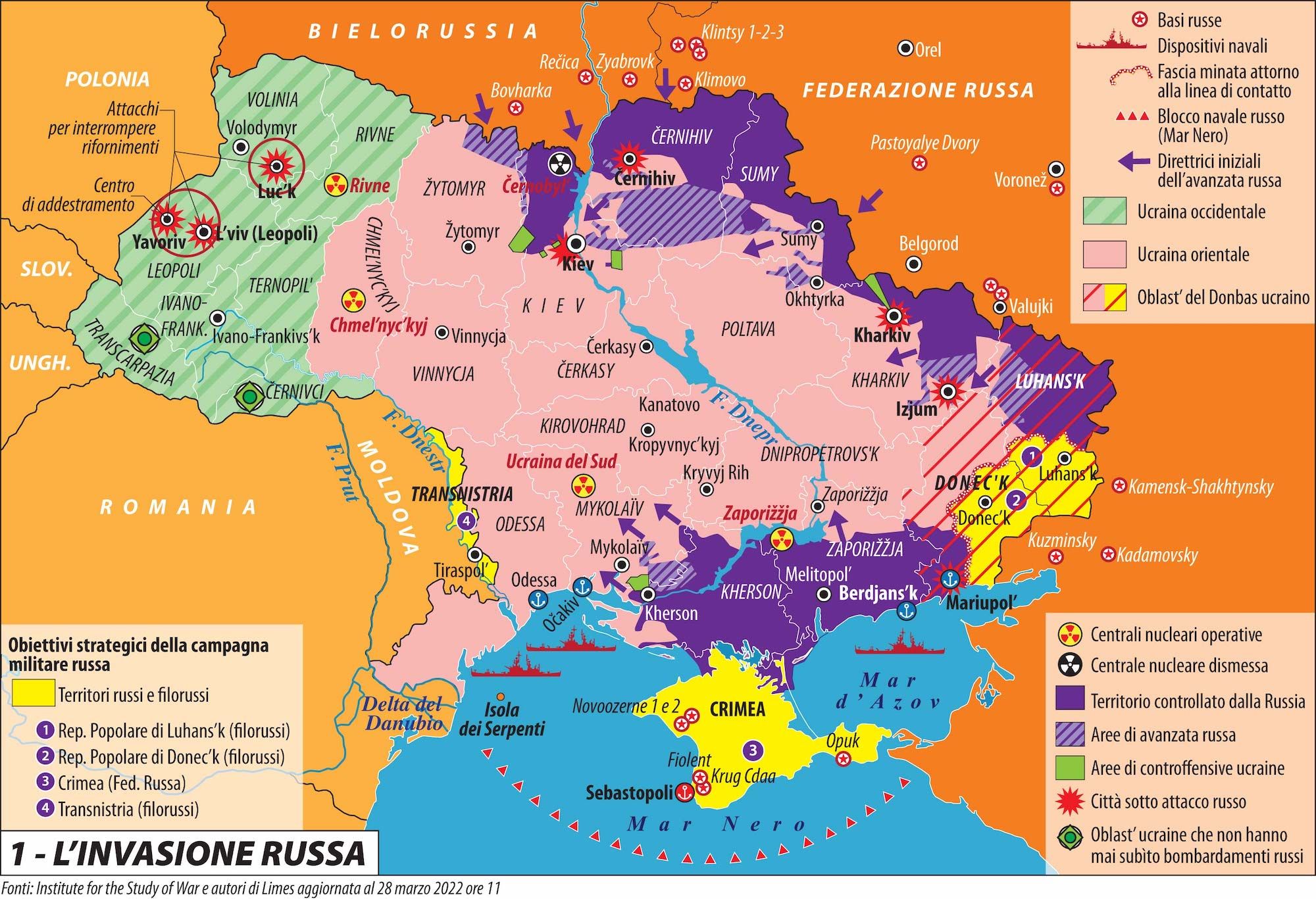 Condividendo inizialmente questa lettura, gli Stati Uniti hanno inviato rifornimenti all’Ucraina attraverso la Polonia; una manovra volta a segnalare che Washington appoggiava la resistenza ma non pensava che la Russia corresse dei rischi. Mosca così ha continuato a insistere lungo tre direttrici: dalla Bielorussia a nord, dal Donbas a est e dalla Crimea a sud.