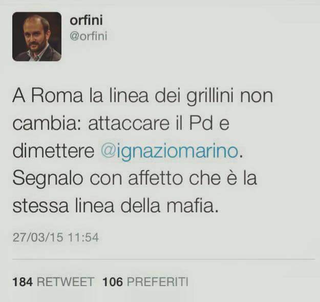 Il tweet di Orfini di marzo, senza scomodare il sillogismo aristotelico, accusava i grillini di avere la stessa linea della mafia, ora possiamo dire che il PD ha stessa linea della mafia, visto che è stato il PD di Orfini a far cadere Marino.