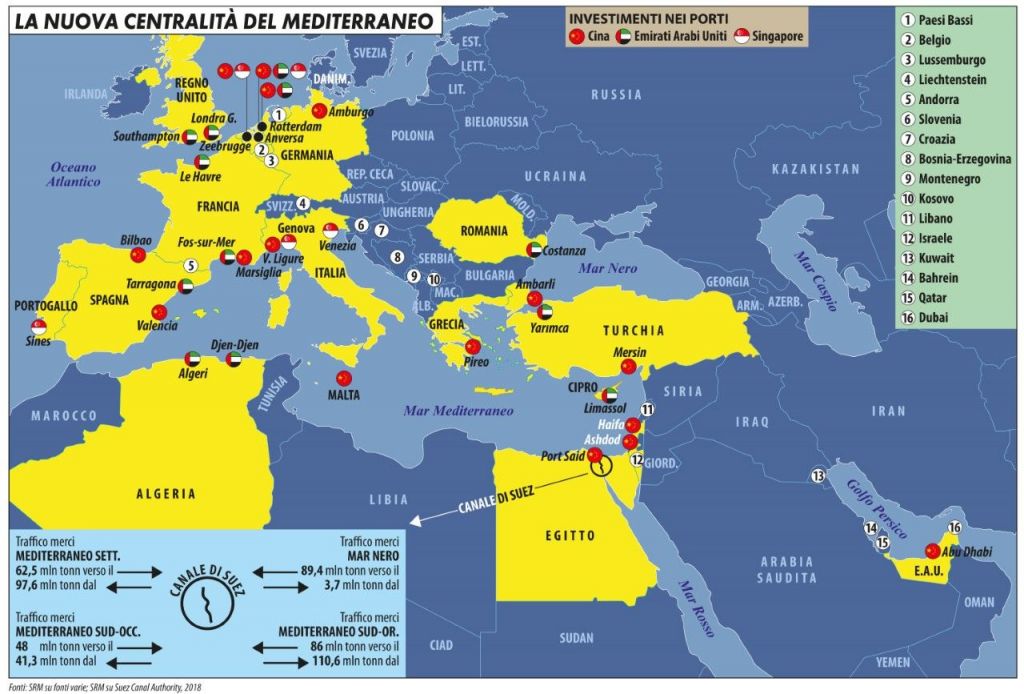 Con le nuove vie della seta, Pechino ha puntato i suoi occhi sul bacino. “Nastro trasportatore” più che regionale, il Mediterraneo per la Cina è prima di tutto approdo privilegiato per le sue merci, che qui giungono sia in destinazione che in transito, per ripartire alla volta dell’America. Per questo la Repubblica Popolare ha investito fortemente nei porti locali. A partire da Suez .