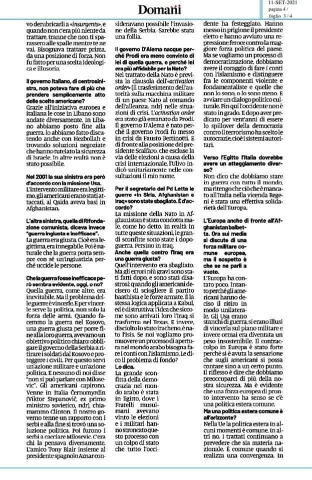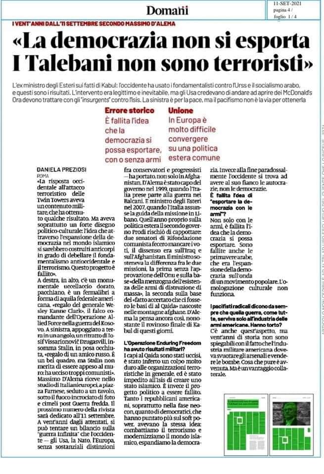 In un’intervista a quotidiano Domani, l’ex premier e segretario dei democratici di sinistra Massimo D’Alema dice che “la risposta occidentale all’attacco terroristico delle Twin Towers aveva un contenuto militare, che ha ottenuto qualche risultato.