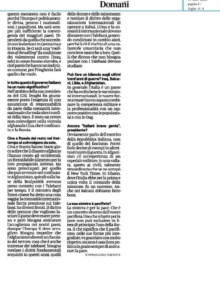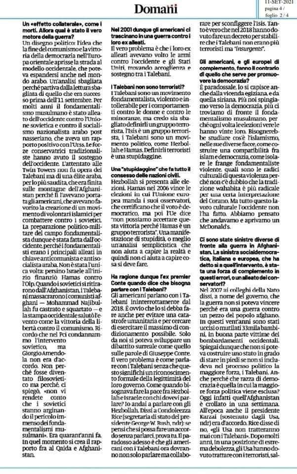 Sostiene anche l’ex premier che “i Talebani sono un movimento fondamentalista, violento e intollerabile per i comportamenti contro le donne e contro le minoranze, ma credo sia sbagliato definirli un gruppo terrorista. L’Isis è un gruppo terrorista, i Talebani sono un movimento politico, come Hezbollah e Hamas. Definirli terroristi è una stupidaggine”, tant’ che “gli americani parlano con i Talebani ininterrottamente dal 2018″.