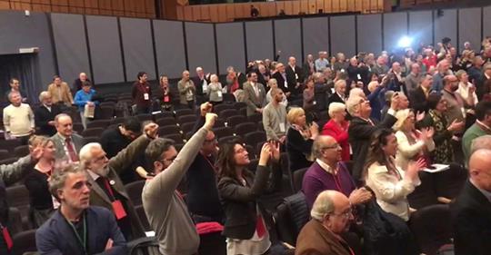 Tutti in piedi e pugni chiusi: il congresso Mdp canta l’Internazionale