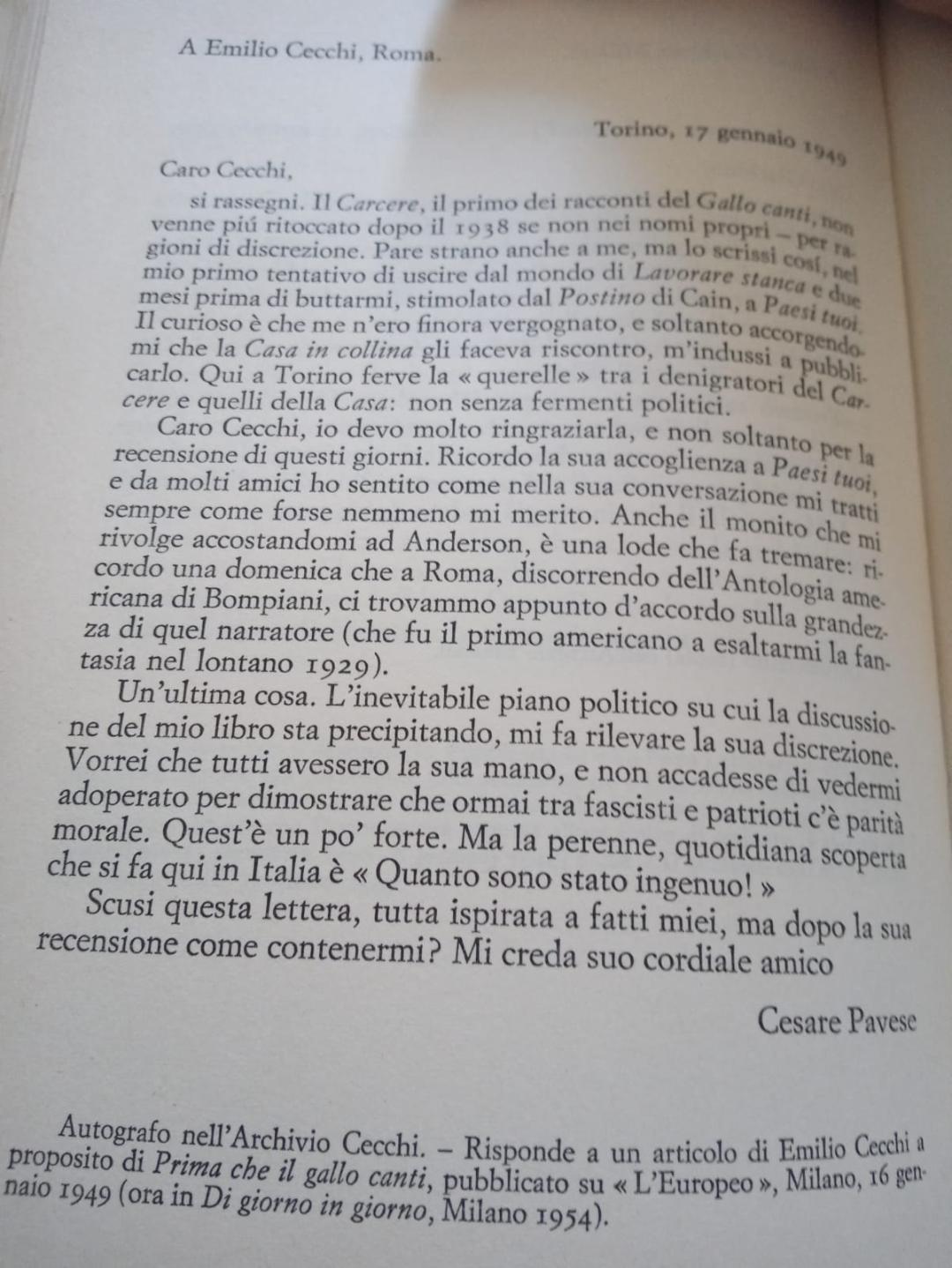 Ma già all’uscita della Casa in Collina, Pavese, in una lettera del 17 gennaio del 1949 al critico Emilio Cecchi, con sincerità si sfoga sui “fermenti politici” con cui era stato accolto il libro: