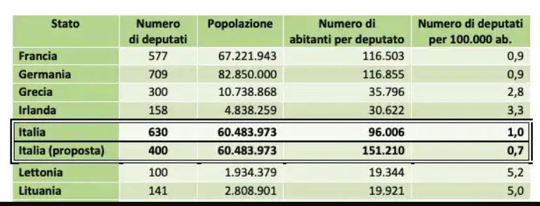 Una volta approvata, dopo il referendum, avremmo un rappresentante, un deputato ogni 96mila abitanti e un senatore ogni 192mila, passando a un deputato ogni 152mila abitanti. Lo 0,7 per ogni 100 mila abitanti fa la più bassa percentuale di rappresentatività in Europa. Che non sono solo numeri, ma indice di democrazia!