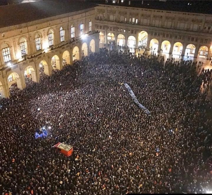 Missione pienamente riuscita e risultato almeno raddoppiato. In piazza persone di tutte le età, molti giovanissimi, coppie con bambini, anziani, disabili, stranieri. La maggior parte con in mano delle sardine fabbricate a casa da sventolare, di tutti i materiali: carta, stoffa, fil di ferro, dipinte su cartelloni e rappresentate in tutti i modi. Sul Crescentone di piazza Maggiore tutti stretti l’uno all’altro, per l’appunto come sardine. Una protesta senza bandiere anche se hanno partecipato esponenti del Pd (come Andrea De Maria, Luca Rizzo Nervo e l’assessore del Comune di Bologna, Matteo Lepore) e di ‘Emilia-Romagna coraggiosa’ (come Elly Schlein), la lista a sinistra del Pd. Ma il miracolo l’hanno fatto loro: i bolognesi e non solo. “Siamo qua per protestare contro le politiche di Salvini – spiega Coline, una ragazza francese che è venuta in piazza con altri stranieri –, lo conosciamo anche nel nostro Paese. Le sue politiche sono razziste, antieuropeiste e populiste”. Fra i manifestanti anche il segretario del Pd di Bologna, Luigi Tosiani: “Bisognava essere qui – dice – a questa manifestazione spontanea, pacifica e gioiosa. La Lega ha detto che, anche a Bologna, l’appoggio a loro è scontato, questa folla dimostra che non è così e che la partita è aperta”. La gente grida: “Bologna non si Lega”; “Siamo tutti antifascisti” e canta ‘Bella Ciao’, anche i giovanissimi. “La resistenza a Bologna è ancora viva” dicono Tiziana, Carla, Oriana e Morena, quattro signore indomite che spiegano: “Bologna è antifascista, noi voteremo Bonaccini. Qui la sinistra ha sempre governato bene. La nostra città ha sempre fatto tesoro dei valori dell’accoglienza e della solidarietà. Noi diciamo ‘no’ al razzismo, alla xenofobia e anche all’incompetenza della Lega e siamo liberi, non abbiamo bisogno che ci liberi Salvini”.