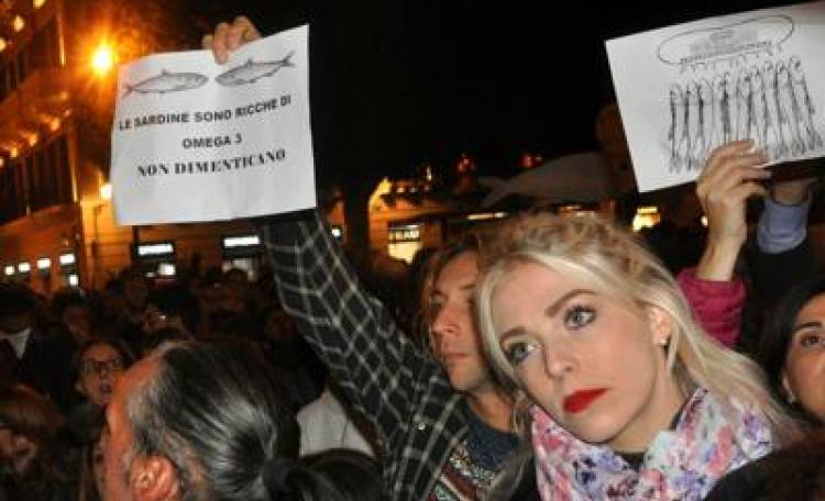 E siccome è notte e come spesso mi capita non dormo dirò ancora qualcosa sulle sardine urbane. Tanto più che qualche amico mi ha sfottuto sarcasticamente come l’aedo e il menestrello della sarda. Sicchè, per ripicca, e’ proprio come pescivendolo ermeneuta che vorrei incartare il pescato con ulteriori pensieri. Pescato abbondante più che mai, miracoloso, come risulta dalle immagini che l’ittiodotto ci porta da Firenze, Livorno, Napoli e altre piazze d’Italia.