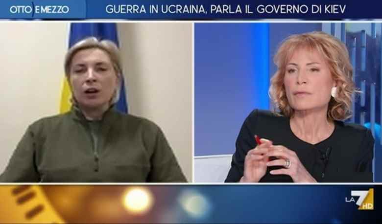 Insomma, il gelo era sceso nello studio, dopo che – intervistata da Gruber – Iryna Vereshchuk, divisa verde e sguardo di ghiaccio, ha detto a nome del governo ucraino, da lei rappresentato nella veste di vicepremier, le seguenti cose: a) Il governo ucraino sa qual è la verità e ha il coraggio di dirla; b) la verità è una sola; c) il presidente è il popolo, il popolo si riconosce nel presidente; d) no-fly zone subito sulle centrali nucleari; e) intervento militare degli USA in Ucraina; f) garanzie internazionali occidentali, da parte di USA e GB, per l’Ucraina per il dopoguerra; g) Crimea e Donbass restituite all’Ucraina, dopo periodo di monitoraggio internazionale; h) né il riconoscimento delle repubbliche del Donbass né della Crimea né la neutralità dell’Ucraina possono costituire base di trattativa con la Russia.
