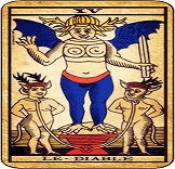 Come sono generati allora i demoni? Sono il risultato del concorso di due principi, ovvero della volontà e della immaginazione. Un desiderio perverso o contrario alla natura seguito dalla corrispondente immaginazione ne costituiscono l’atto di nascita. Nell’immagine, i due personaggi incatenati nel quindicesimo Arcano non sono i figli o le creature del personaggio centrale, come saremmo tentati di supporre, data la piccola statura comparata col demonio. Al contrario, sono i genitori che sono divenuti suoi schiavi. Essi rappresentano la volontà perversa e l’immaginazione contraria alla natura che insieme hanno dato origine a un essere dotato di desiderio e immaginazione che domina le stesse forze che lo hanno generato. Noi ignoriamo quanto può essere terribile il potere che risiede nella nostra volontà ed immaginazione!