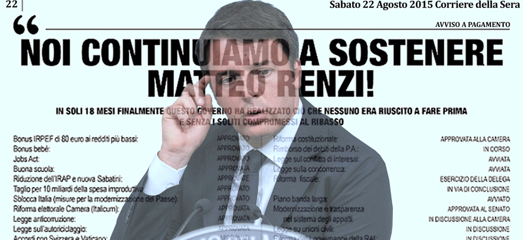 Per la seconda volta sul Corriere della Sera, sabato 22 agosto 2015, una pagina a pagamento a sostegno del Presidente del Consiglio.