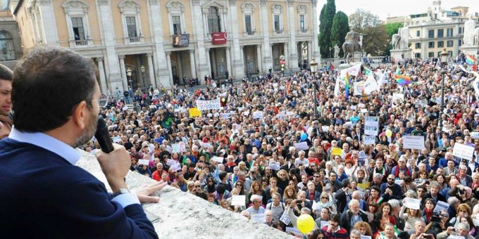 Era bella e splendente più del solito Piazza del Campidoglio domenica, animata da una grande assemblea civica autoconvocata, democratica e di sinistra, con alcune migliaia di romani convenuti lì non per difendere Marino, ma per preservare soprattutto la democrazia e la sovranità popolare. Una svolta rispetto alla melassa consociativa di questi ultimi decenni in cui si è impantanato anche il senso civico urbano. Sono stati, questi ultimi, tempi in cui il consociativismo palese ed occulto tra politica (di destra e di sinistra), affari e interessi corporativi diversi, ha corrotto dalle fondamenta il sistema di governo della città e la sua etica pubblica