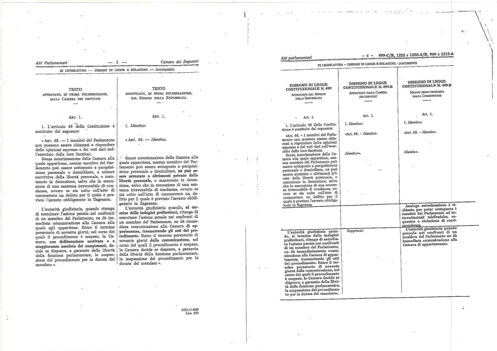 Ecco quindi che la Commissione referente propose – ed il presidente Spadolini ammise in Aula – due emendamenti che introducevano due nuovi commi (uno per le autorizzazioni delle intercettazioni e l’altro per l’informativa alla Camera di appartenenza sui processi in corso). Anche visivamente, il testo proposto dalla Commissione referente il 15 giugno 1993 (Atto Senato n. 499-C/R) conteneva tre colonne: i due commi aggiuntivi erano collocato uno in corrispondenza del comma soppresso, l’altro addirittura senza alcuna corrispondenza nei commi delle precedenti letture.