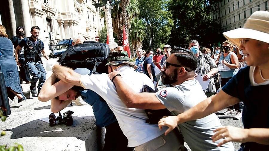 Il video toglie le parole. Si sente il giornalista, Francesco Giovannetti, rivolgere qualche domanda a un gruppetto di manifestanti contrari al Green pass. Poi uno di questi lo apostrofa in malo modo intimandogli di andarsene altrimenti “ti taglio la gola”. Il giornalista gli chiede conto della frase e allora quello si gira e lo colpisce al volto con una sequenza di pugni.